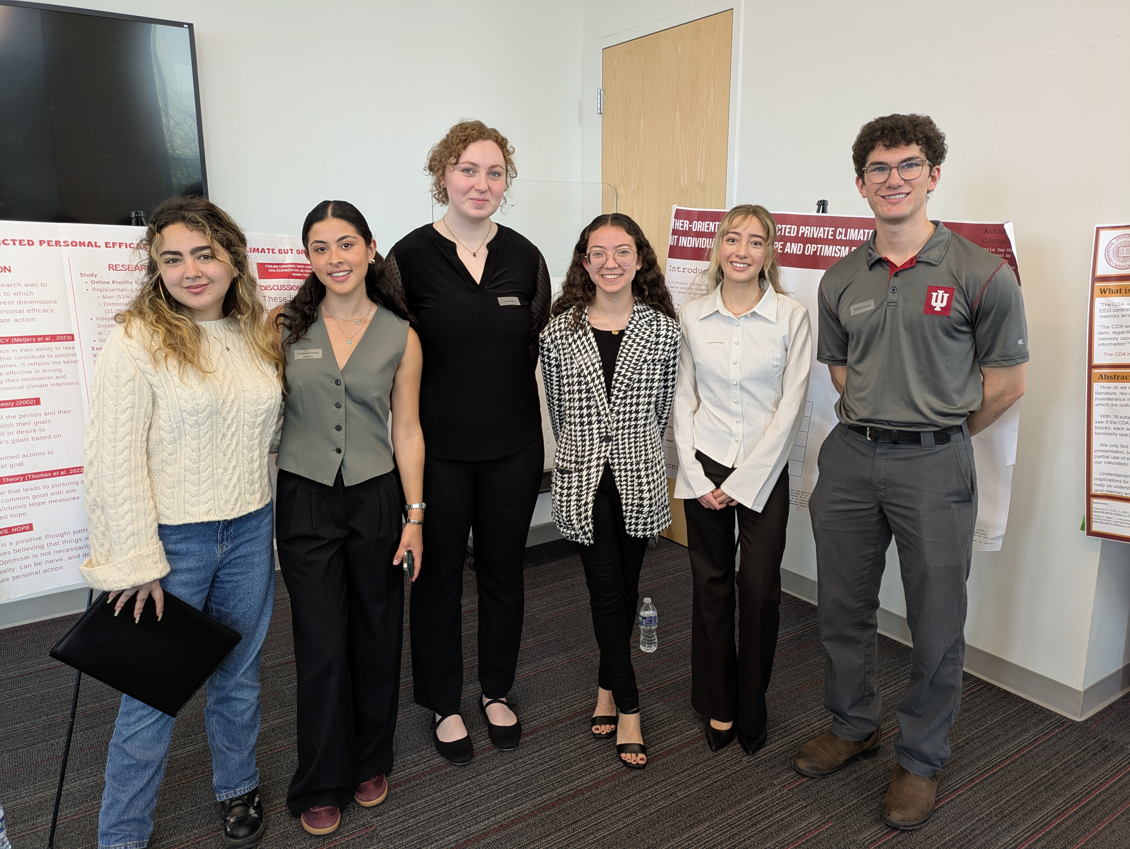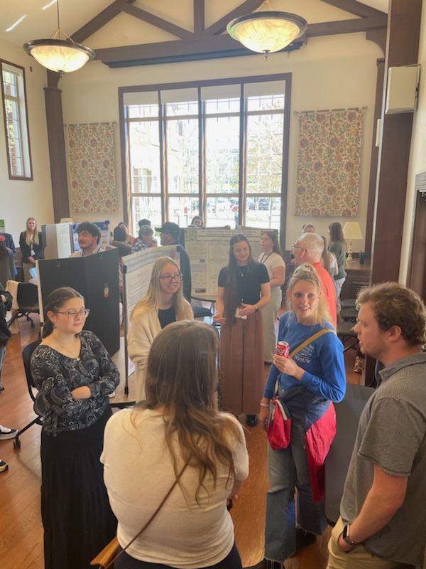 Sam, Jillian, and Ed chat with HirtLab undergraduate RAs Ellen Sanderson, Caitlyn Leraas, Kendall Mirise, and Jack Johanson (pictured left to right) as they presented some of the lab's research at the 2024 Hutton Honors College Poster Fair!