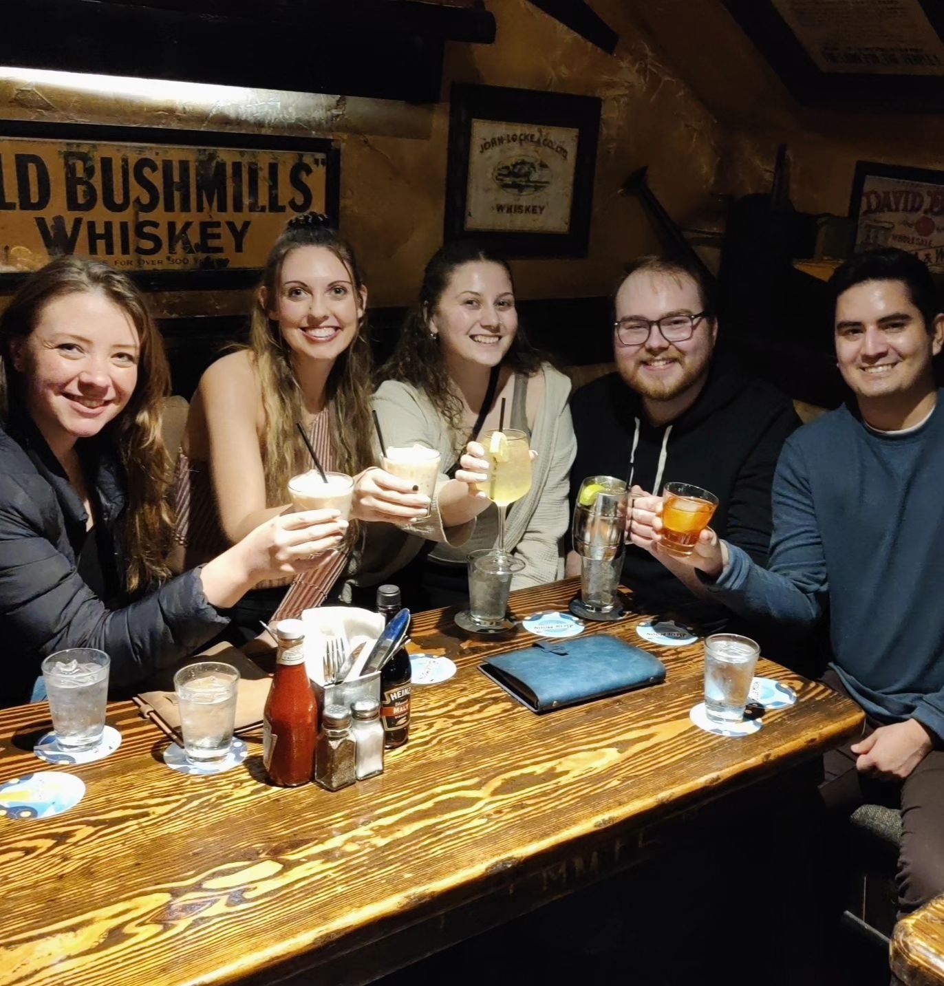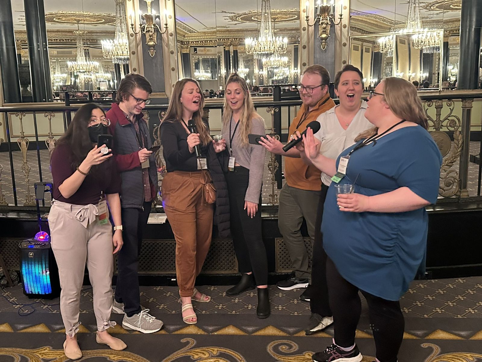 Sam, Jillian, and Liz, along with other social psychology graduate students Andrew White and Antonio Viera hanging out during the annual Society for Personality and Social Psychology conference. It was held in San Diego, California in 2024!Sam, Jillian, Andrew White, and more sing karaoke at the 2024 annual Midwestern Psychological Association conference in Chicago!